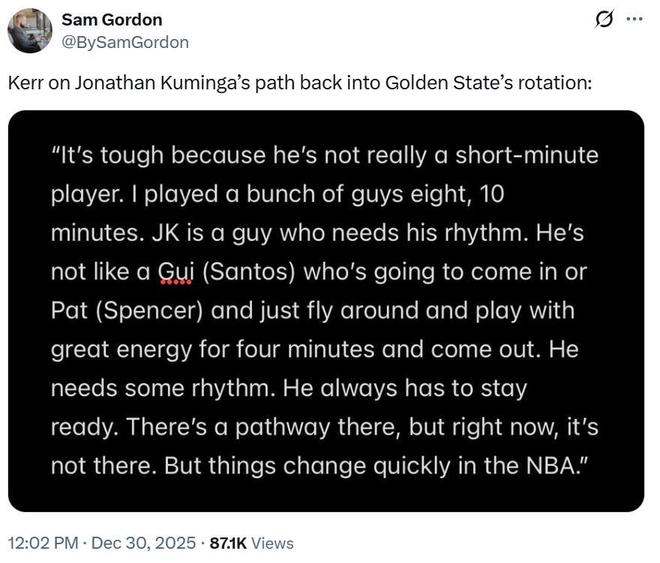 這樣一來,12月份勇士隊(duì)12場比賽中,庫明加被DNP8場,僅獲得4場登場機(jī)會(huì)。