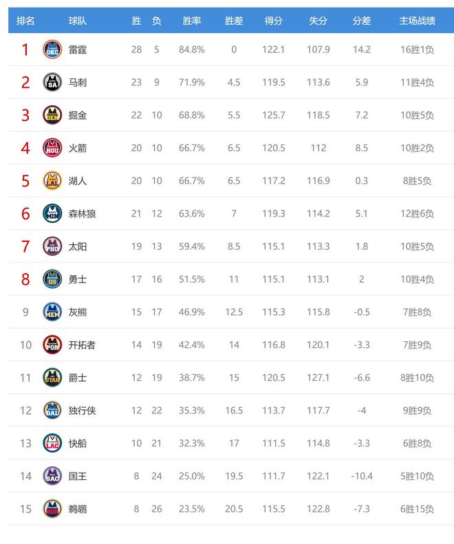 NBA西部最新積分榜:雷霆28勝領跑,刺掘連敗,火箭第4,勇士第8