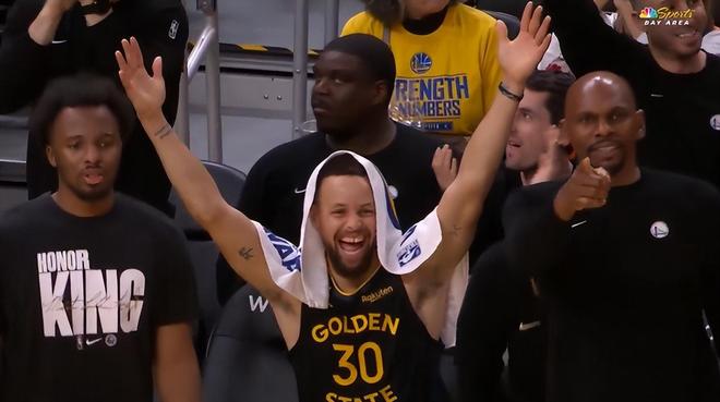 庫里在場下的興奮勁兒很足,看到希爾德三分命中他雙手舉天+大小露齒,庫里知道這場比賽拿下了,而且自己在末節只需要打3分鐘等于提前打卡下班。