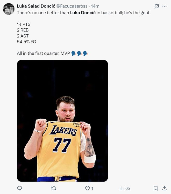 末節東契奇不在場湖人打出16-7瘋狂追分,沒有東契奇的陣容才是湖人最能防的陣容,東契奇登場命中一個高難度的金雞獨立三分球,可隨后因為東契奇的防守實在是太差,快船再度拉開到12分,依靠隊友的努力追到只差6分,但東契奇空位的續命三分不投,等對方防守回來再翻身跳投打鐵。