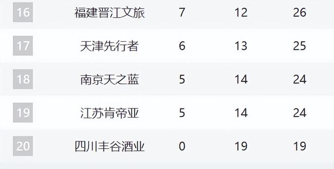 16-20分別是福建、天津、同曦、江蘇和四川。福建這輪擊敗四川,止住頹勢,但后續可能繼續下跌。天津和江蘇最近的趨勢非常好,戰績持續提升。同曦已經四連敗,他們本賽季好像看不到希望了。四川則保持19連敗。