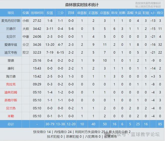 愛德華茲20投13中,三分7中4,罰球3中2,空砍32分11籃板2助攻1蓋帽8失誤,正負值-16。迪溫琴佐高開低走,上半場9中6轟下17分,下半場10中1僅得5分。第四節早早進入垃圾時間,英格爾斯居然和波斯特還爆發了沖突。