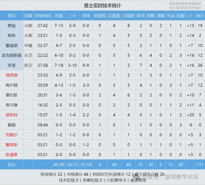 此役庫里18投7中,三分10中3,罰球9中9,砍下26分2籃板7助攻4搶斷,正負值+16。庫里生涯總得分追平皮爾斯(26397)并列歷史第19,再往前一位是鄧肯(26496分)。上半場打完,勇士領先1分,第三節勇士38-17單節凈勝21分。