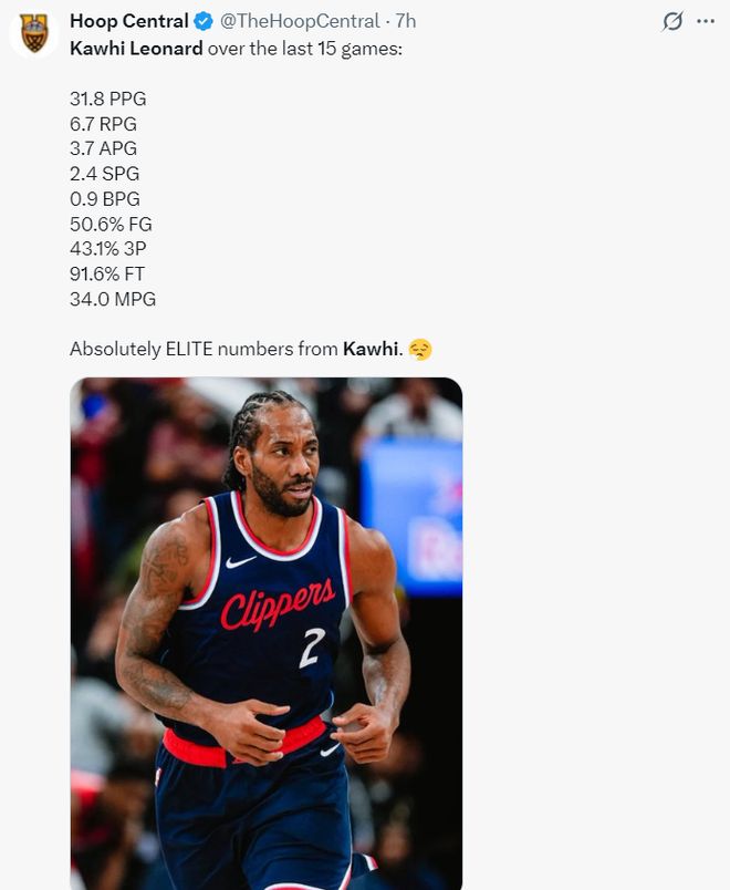 自12月20日以來小卡出戰(zhàn)了15場比賽(缺席了三場),他場均達到32.1分聯(lián)盟第一,這期間快船18場比賽贏下了其中的15場比賽,快船期間的戰(zhàn)績也是聯(lián)盟第一。