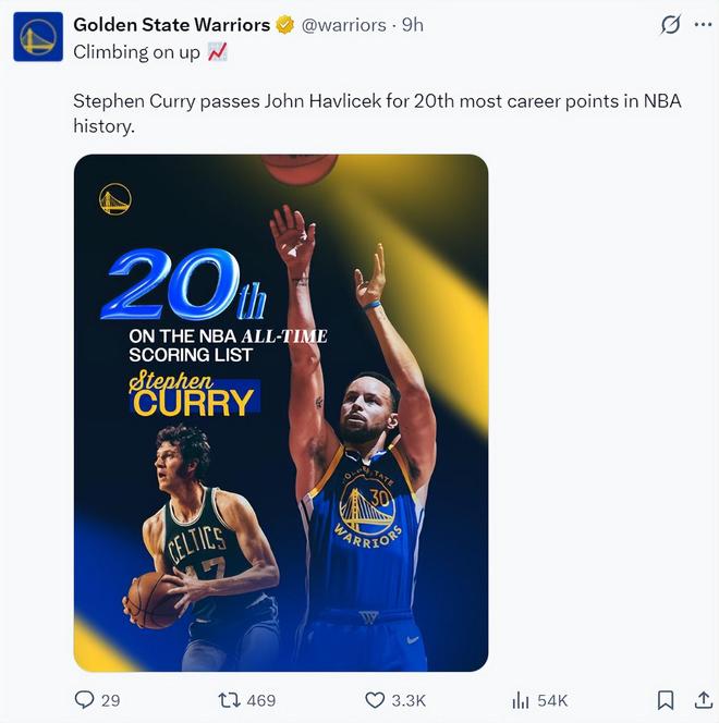 這場比賽后庫里常規賽得分26397分超過哈夫利切克,和皮爾斯并列歷史第19,距離第18位的鄧肯還差99分,庫里迎來了里程碑的夜晚。