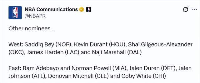 東部: 阿德巴約和鮑威爾(熱火)、杜倫(活塞)、杰倫-約翰遜(老鷹)、米切爾(騎士)、科比-懷特(公牛)