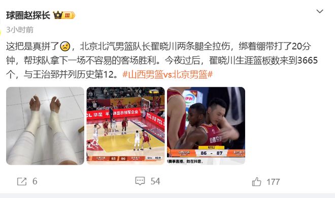 北京贏得不容易,但代價也是慘重的,翟曉川又拉傷了,賽后趙探長曬出了川隊雙腿纏滿繃帶的照片,表示:翟曉川兩條腿全部拉傷,綁著繃帶打了20分鐘。