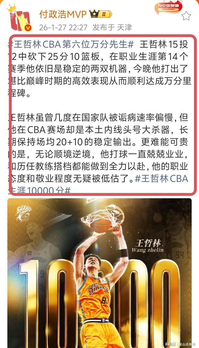 媒體人付政浩發文稱: 王哲林15投12中砍下25分10籃板,在職業生涯第14個賽季他依舊是穩定的兩雙機器,今晚他打出了堪比巔峰時期的高效表現從而順利達成萬分里程碑。王哲林雖曾幾度在國家隊被詬病速率偏慢,但他在CBA賽場卻是本土內線頭號大殺器,長期保持場均20+10的穩定輸出。更難能可貴的是,無論順境逆境,他打球一直兢兢業業,和歷任教練搭檔都能做到全力以赴,他的職業態度和敬業程度無疑被低估了。