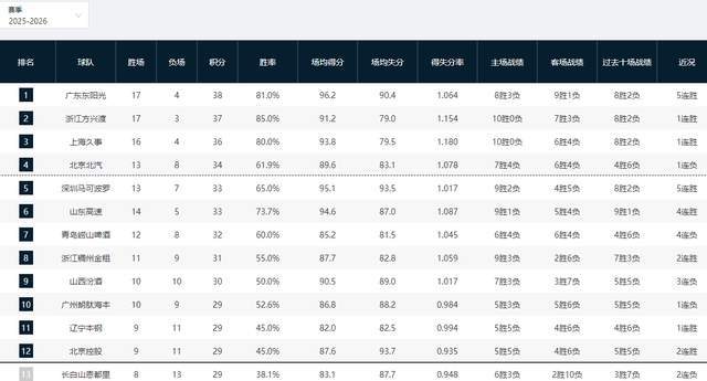 CBA排名大變!廣東登頂,北京斷崖下滑,廣州第10遼寧難保季后賽