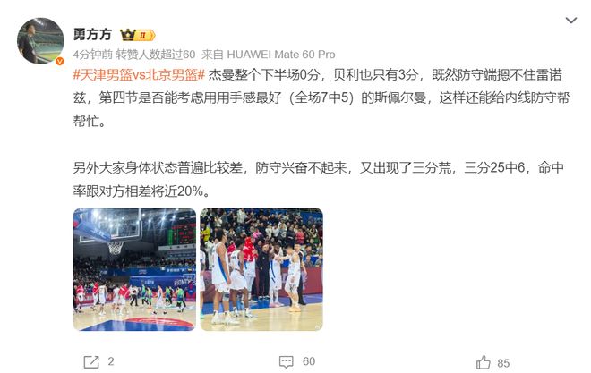 媒體人周赫對北京這場失利非常不滿,他認為末節該棄用的是8中1的杰曼而非斯佩爾曼,因為末節天津是用雷諾茲,北京這邊應該讓斯佩爾曼上去限制他的發揮。