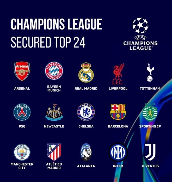 至少確保附加賽球隊(duì):皇馬、利物浦、熱刺、巴黎、紐卡、切爾西、巴薩、葡萄牙體育、曼城、馬競(jìng)、亞特蘭大、國(guó)米、尤文