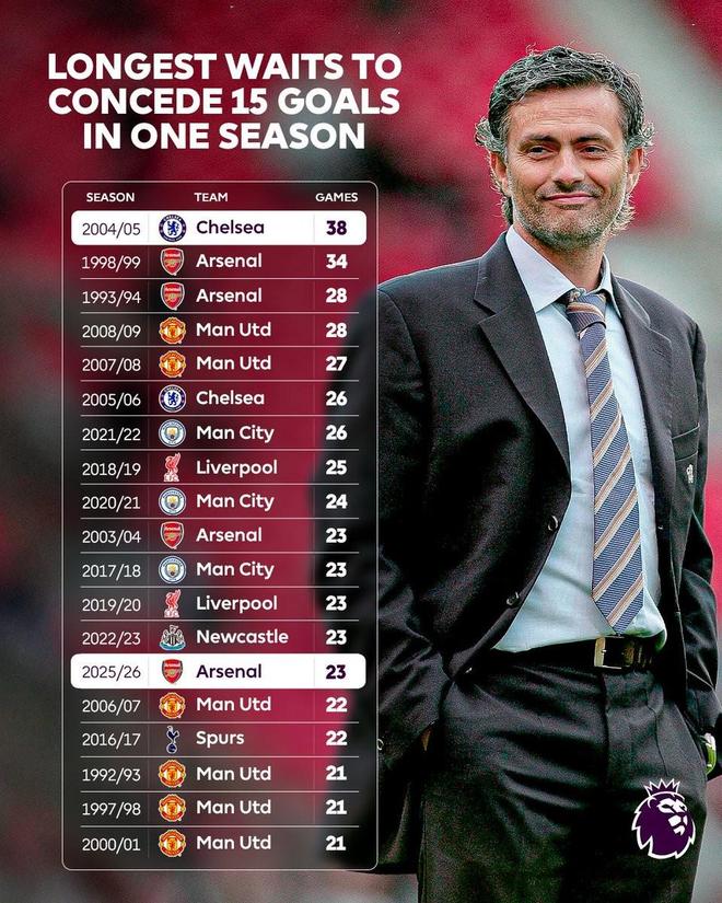 這意味著切爾西2004-05賽季在穆里尼奧的帶領(lǐng)下創(chuàng)造的英超歷史單賽季最少丟球紀(jì)錄(38場15球)又保住了一個賽季。