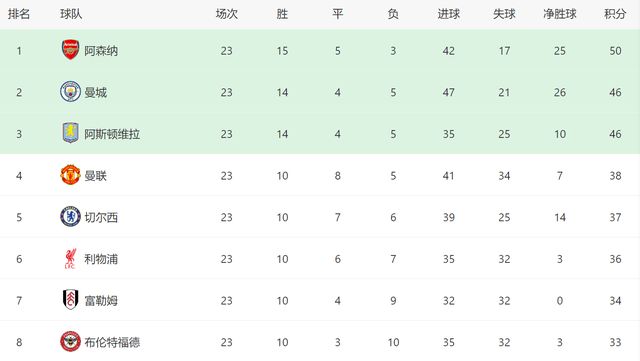 隨槍手2-3曼聯,藍軍3-1,英超第23輪最新積分榜如下!1-3名差4分